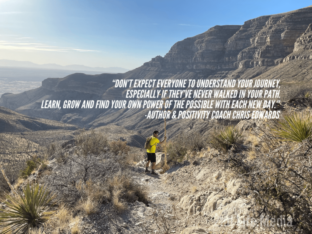 “The Journey toward positivity. Don’t expect everyone to understand your journey, especially if they have never walled in your path. Learn, grow and find your own POWER of the POSSIBLE with each New Day.” Quote by Author & Positivity Coach, Chris Edwards from his book 90 Days to a Glass Half Full Life Style. Lessons for positivity excerpt:
