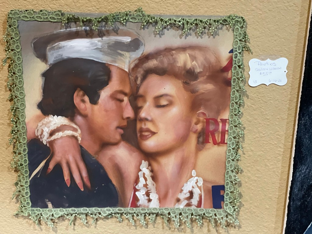 We met the Alamogordo based artist Marty H. Torres recently after viewing her expanded works of art now showcased at Roadrunner Emporium Fine Arts Gallery, Antiques and more, 928 New York Avenue Alamogordo, New Mexico. Mrs. Torres showcases her collection of eclectic paintings and fine art pieces in an incredibly unique and well executed corner of Roadrunner Emporium. Her works stand out as many of her works begin with an acrylic base, but she adds other media to give a three-dimensional look. Some of her works are quite whimsical such as her Wizard of Oz inspired collection of paintings or the Charlie Chaplin inspired painting. Other are much more serious such as a few of her paintings highlighting Native Americans and her Sailor and Woman painting which is compelling yet sensual.