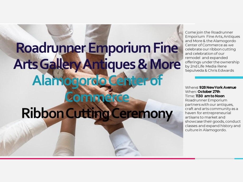 Join the community to celebrate the expansion of Roadrunner Emporium Fine Arts Gallery, Antiques and More 928 New York Avenue, Alamogordo, Néw Mexico October 27th at 11:30