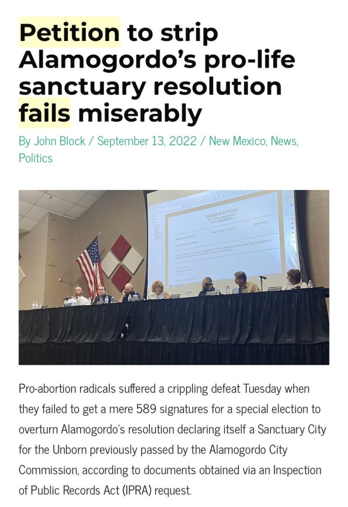 “A radical group of scammers calling themselves New Voices Otero is trying to trick pro-lifers into signing their bogus petition by claiming it will give the voters a choice to vote on the resolution, but they are not telling them that Alamogordo is already a sanctuary city for the unborn,” Block wrote.